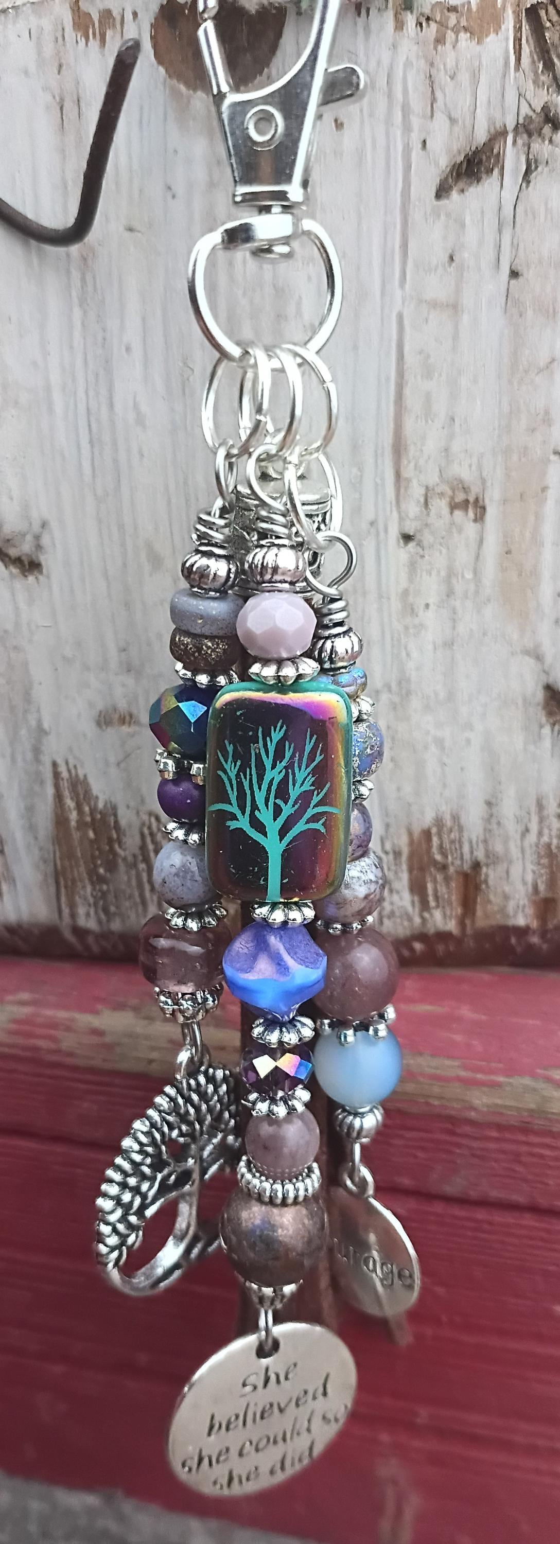 Pretty beaded keychain, zipper pull or "purse bling" add to your favorite purse, bag or backpack. Beaded with a variety of Czech glass beads, glass beads and stones. Silver tone metal spacers, silver tone charms with faux leather. On a lobster claw close keychain ring and open jump rings.
