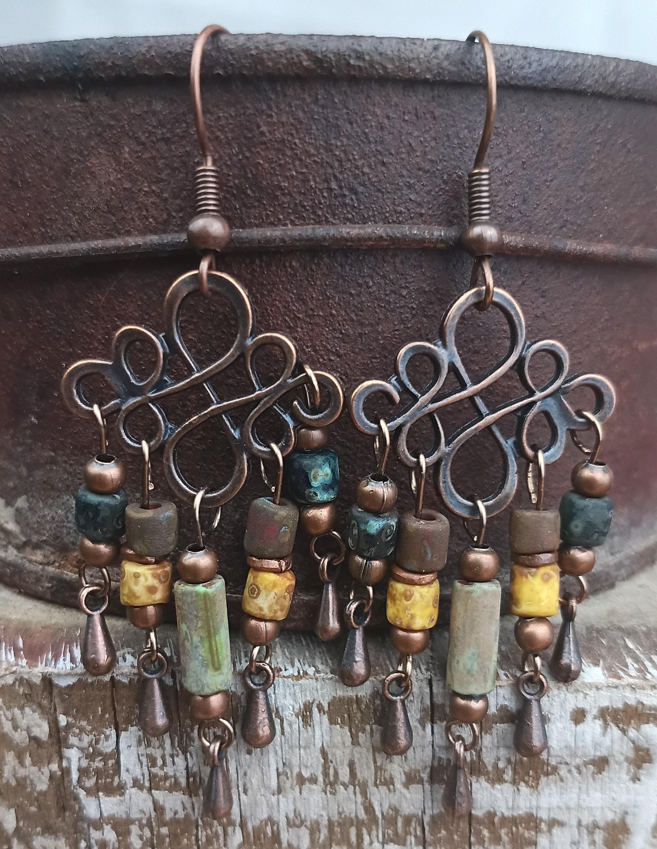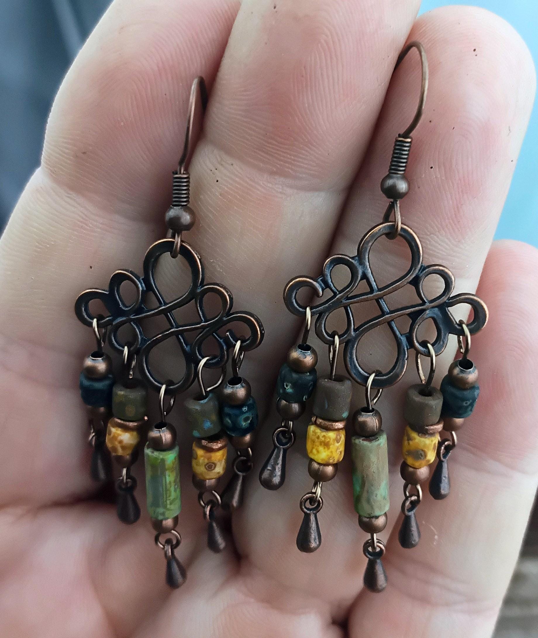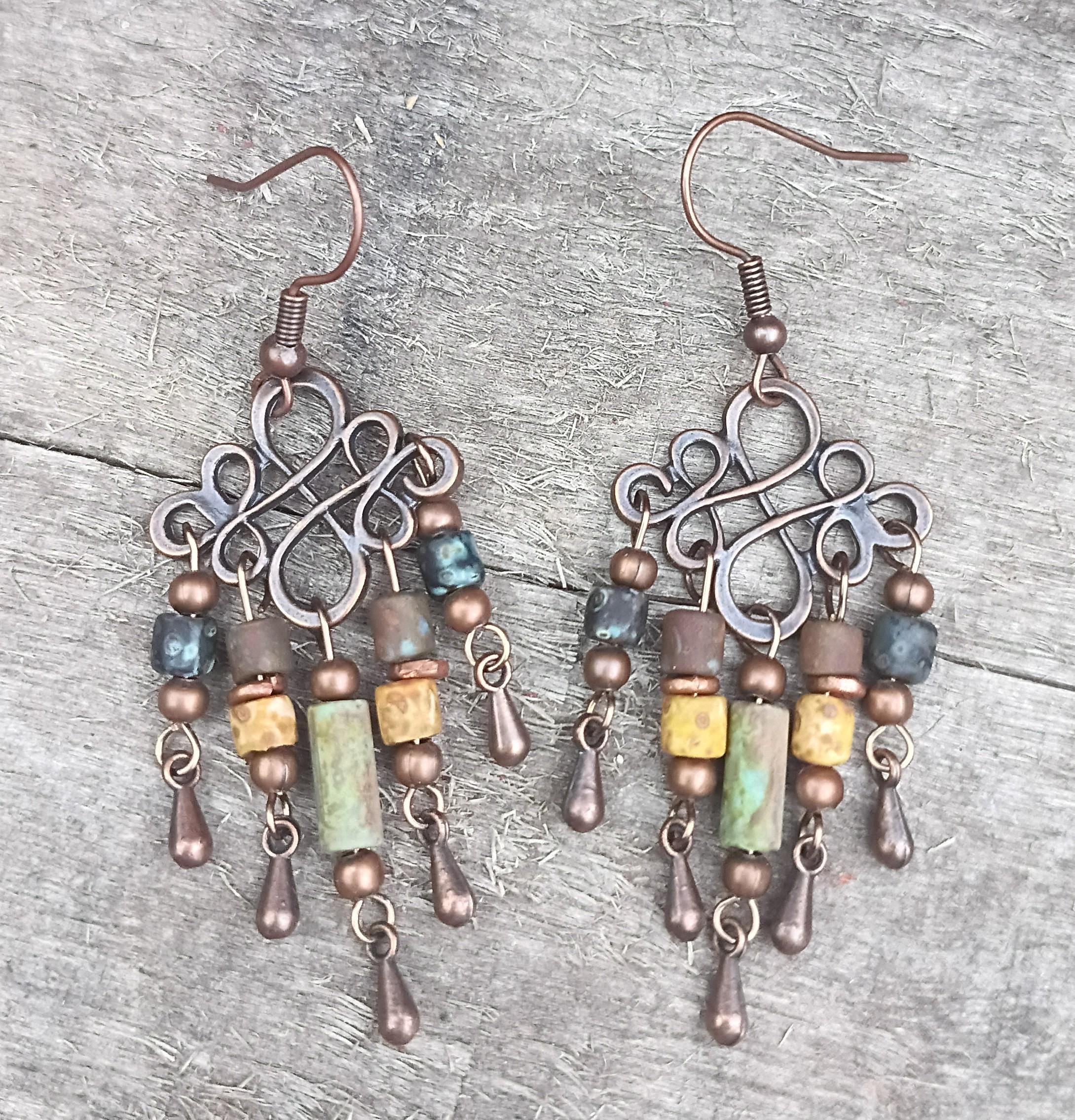 Beautiful rustic boho dangle) chandelier earrings. Copper tone with copper tone ear wires. Czech Picasso glass seed beads in earthy colors with copper metal spacers and tiny copper teardrop dangle. Chandelier link is 20mm x 18mm no lead or nickel. These earrings are light weight and perfect summer or year around earrings!