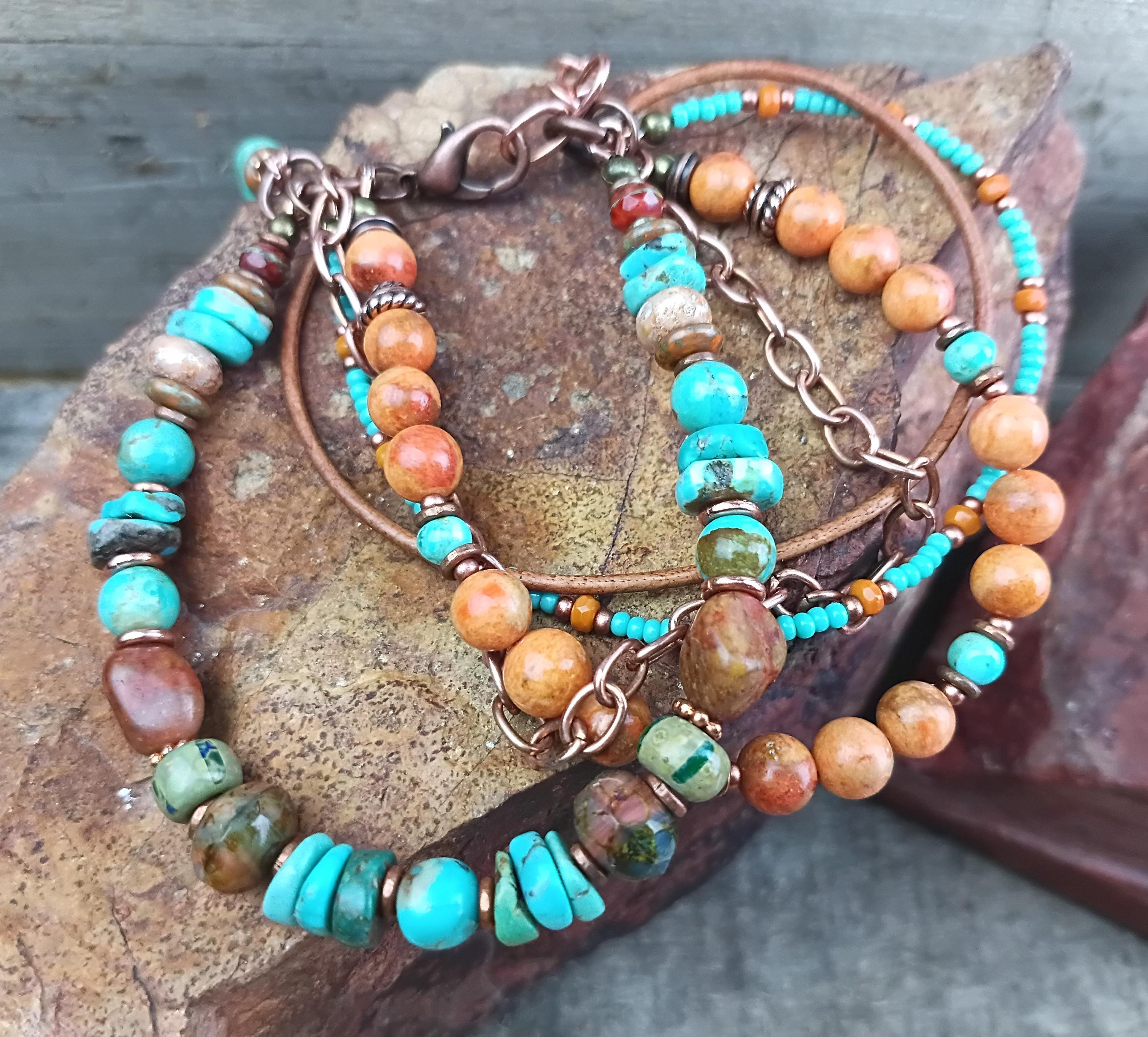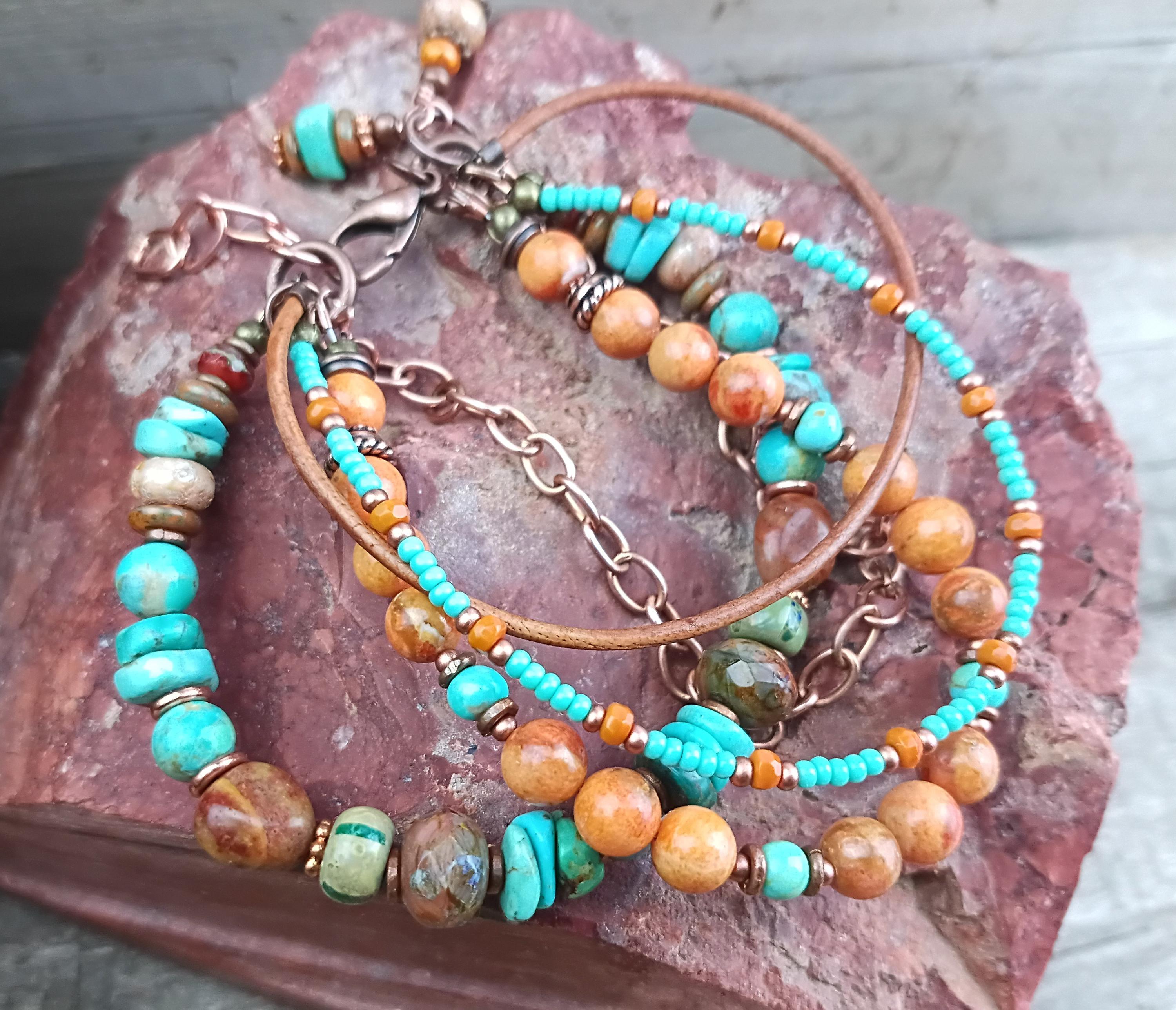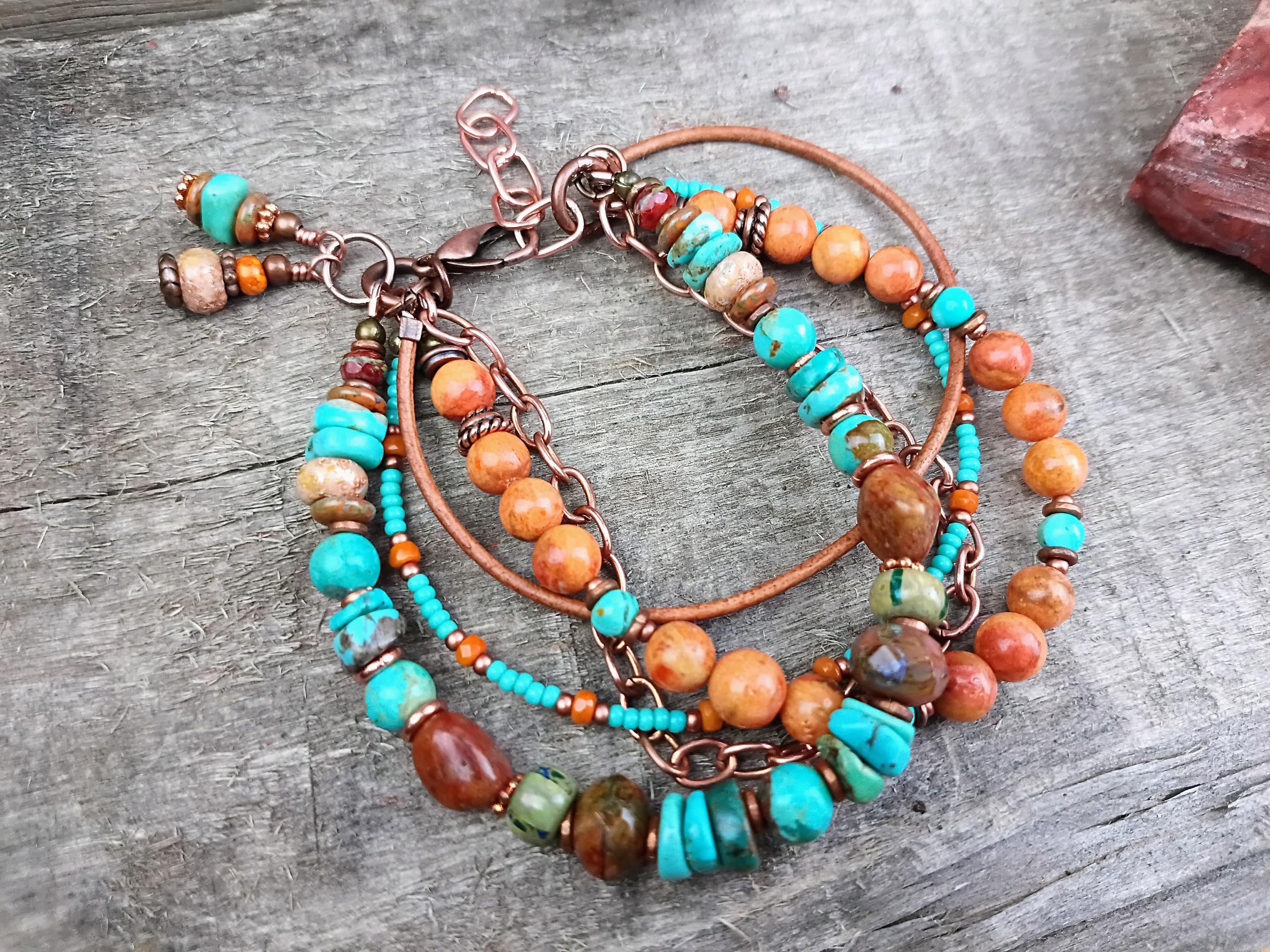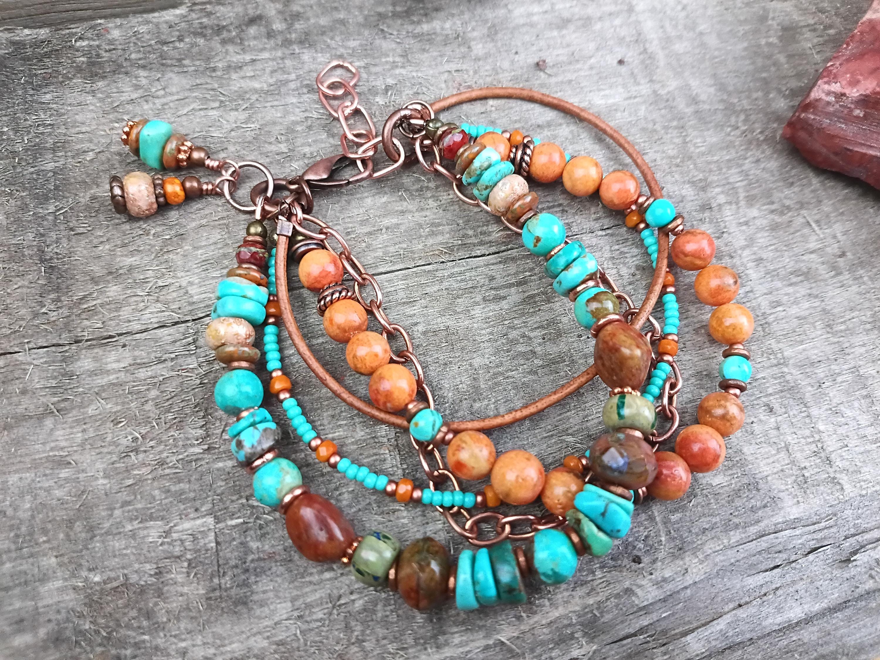 Gorgeous Turquoise and Apple Coral multi strand bracelet, earthy and rustic!
