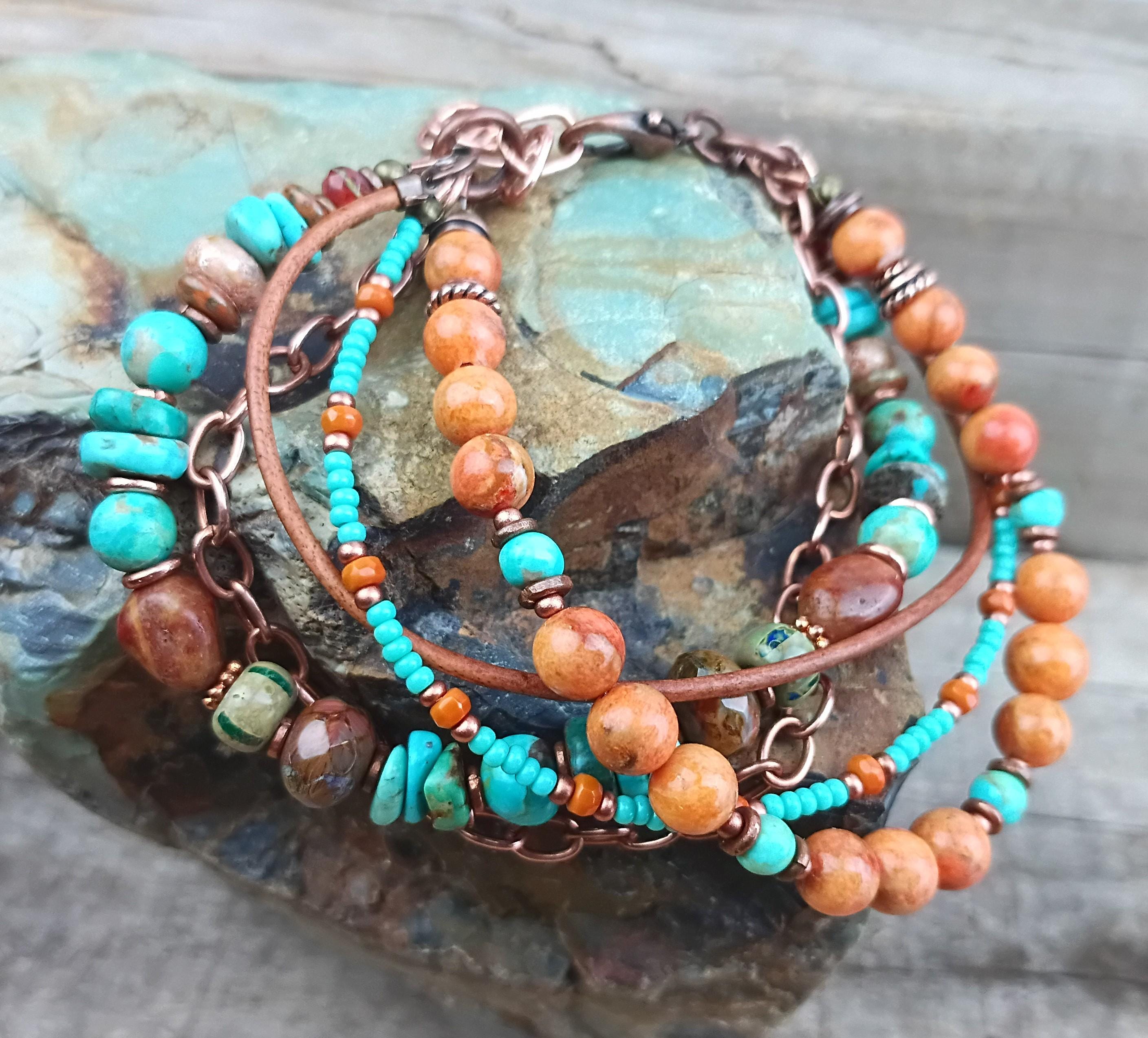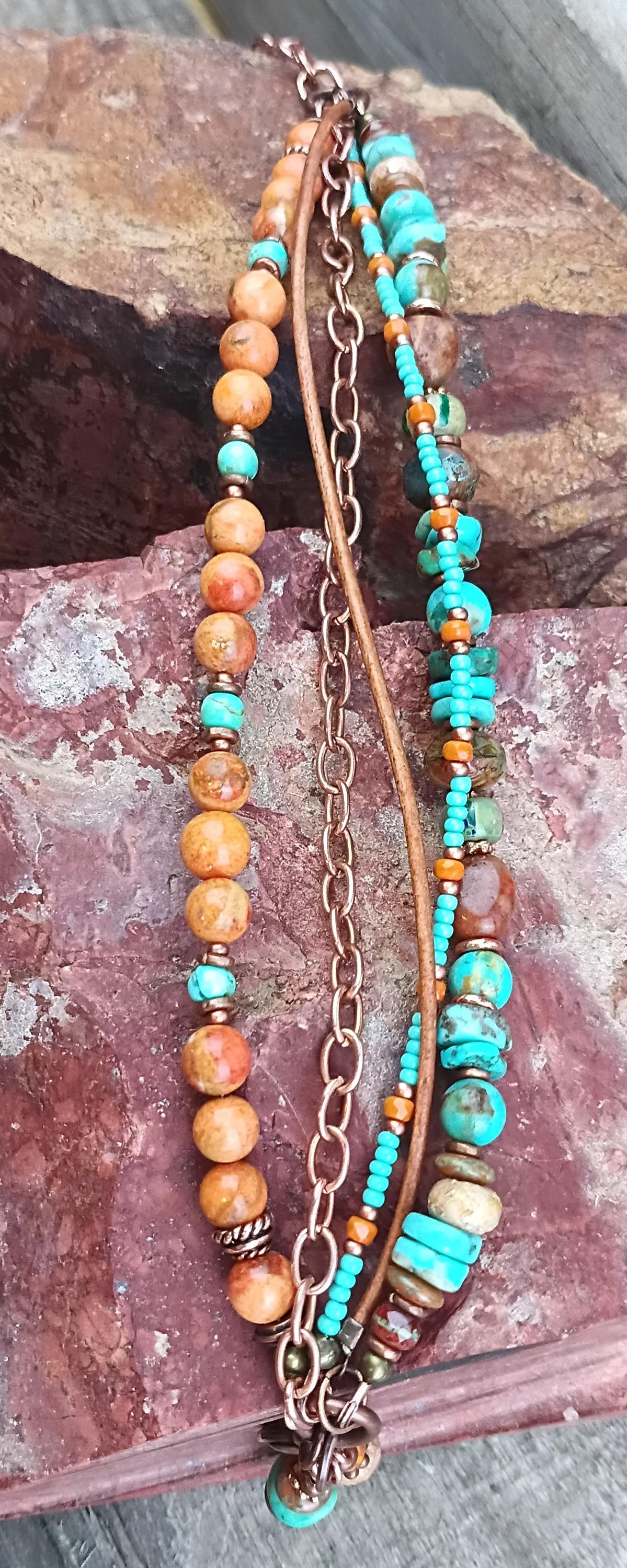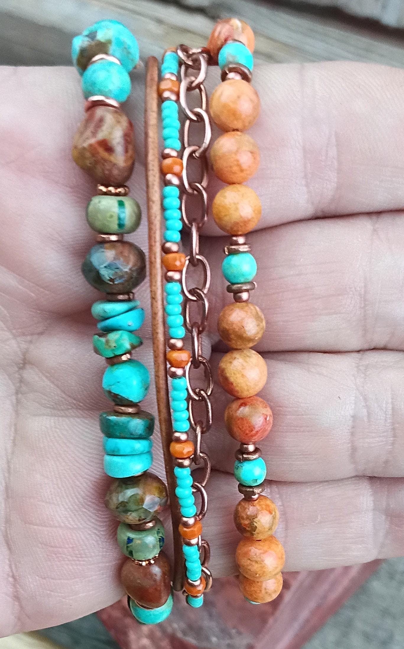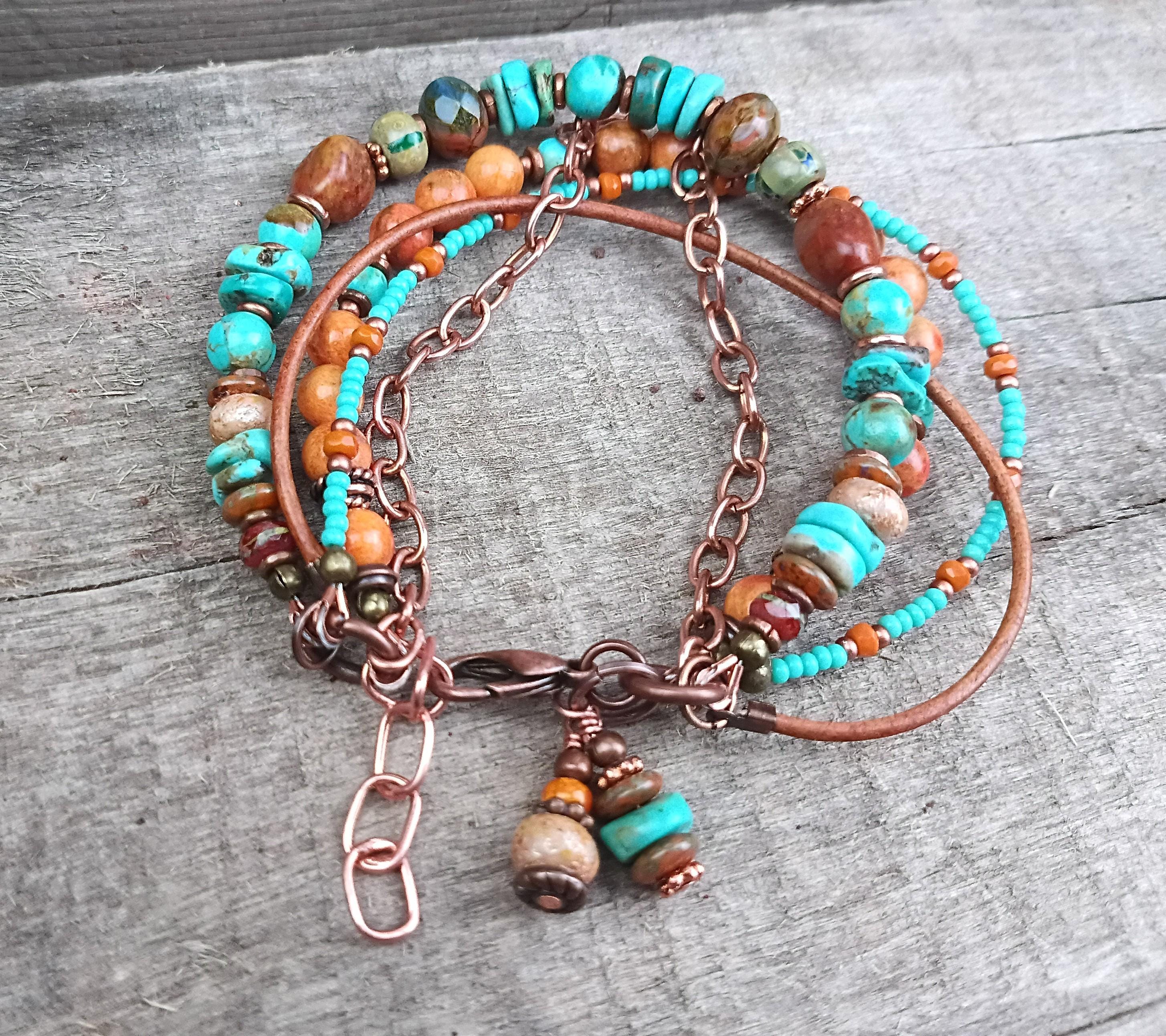 This beautiful bracelet is adjustable with lobster claw, and copper extension chain. Beaded on stainless steel beading wire with wire guards for added protection. Total of 5 strand, 1mm leather cord, 1 copper chain and 3 beaded strands. Kingman Turquoise in half rounds 6/7mm and Heishi disks that are different shapes and sizes. Beautiful shades of turquoise blue's to some green, light matrix with blacks and browns. Paired with 6mm Apple Coral beads that are light orange in color with 4mm Turquoise round beads. Copper spacers and copper seed bead spacers. Turquoise color seed beads along with Czech glass seed beads. Also in the blend are a variety of Czech glass beads in different sizes. 2 beaded wrapped dangle charms.